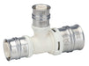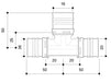 Reduced tee made of PPSU for drinking water and heating system installations. Featuring white fixation rings with integrated inspection holes, fixed stainless steel pressing sleeves and leak function. Pressable with pressing contours F and TH.