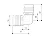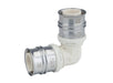 90 degrees elbow made of PPSU for drinking water and heating system installations featuring white fixation rings with integrated inspection holes. fixed stainless steel pressing sleeves and leak function. Pressable with pressing contours F and TH.