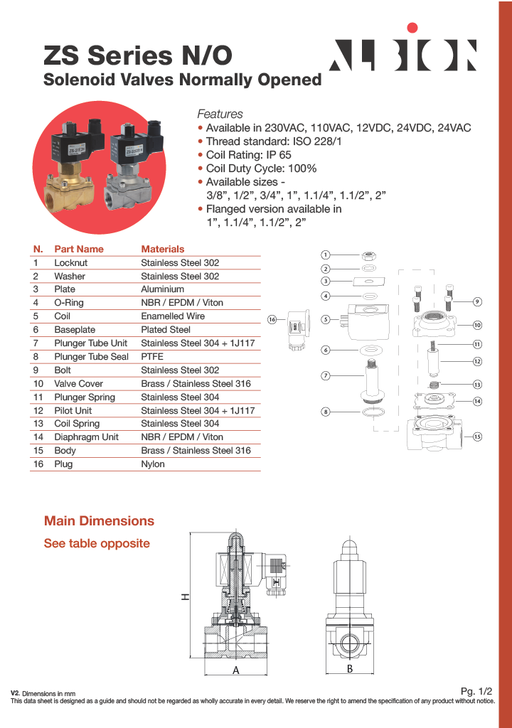 Albion Valves (UK) LtdBrass Solenoid ValveServo-activated 2/2 wayNormally OpenNBR DiaphragmVoltage: 24V ac/dc, 110V ac, 230V ac & 12V dcCoil Rating: IP 65Coil...