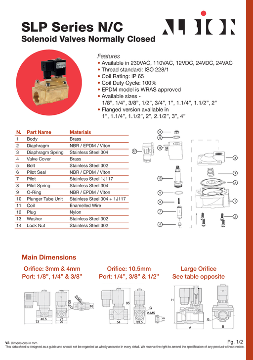 Albion Valves (UK) LtdBrass Solenoid ValveServo-activated 2/2 wayNormally ClosedNBR DiaphragmVoltage: 24V ac/dc, 110V ac, 230V ac & 12V dcCoil Rating: IP 65Co...